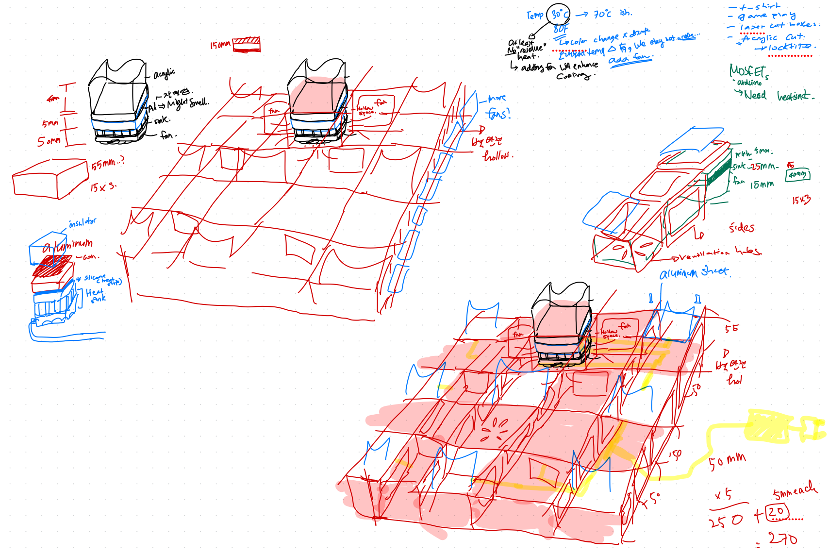 0\) Sketching: I planned to have the microheater to mainly be coupled with a thermocouple, a cooling fan, and having acrylic four walls that will retain heat/cool and vice versa. Then, each will be slotted into the array box with spaces in between measured out.